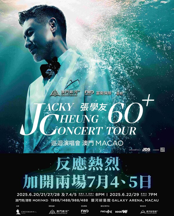 澳门2025年4月21日 /美通社/ — 华语乐坛”歌神”张学友第十个个人演唱会——《「澳門銀河™」荣誉呈献FWD 富卫保险冠名赞助–张学友60+巡回演唱会 澳门》将于今年6月在澳门最大的室内综艺馆——银河综艺馆连开6场以飨乐迷,门票均已火速售罄。在一众”友迷”的殷切盼望下,是次澳门凯旋站将于7月4、5日加开两场,并且早前售罄的首6场将特别加开极少量澳门币1988元座位(视线受阻区)。张学友将成为银河综艺馆开办个人巡演场次最多的天王级歌手。加场场次门票及首6场加开座位门票将一同于4月22日中午12时通过银河票务、FWD MAX、大麦、BOOKYAY、猫眼、uutix、Mpay澳门钱包APP、澳门售票网、纷玩岛小程序同步公开发售。