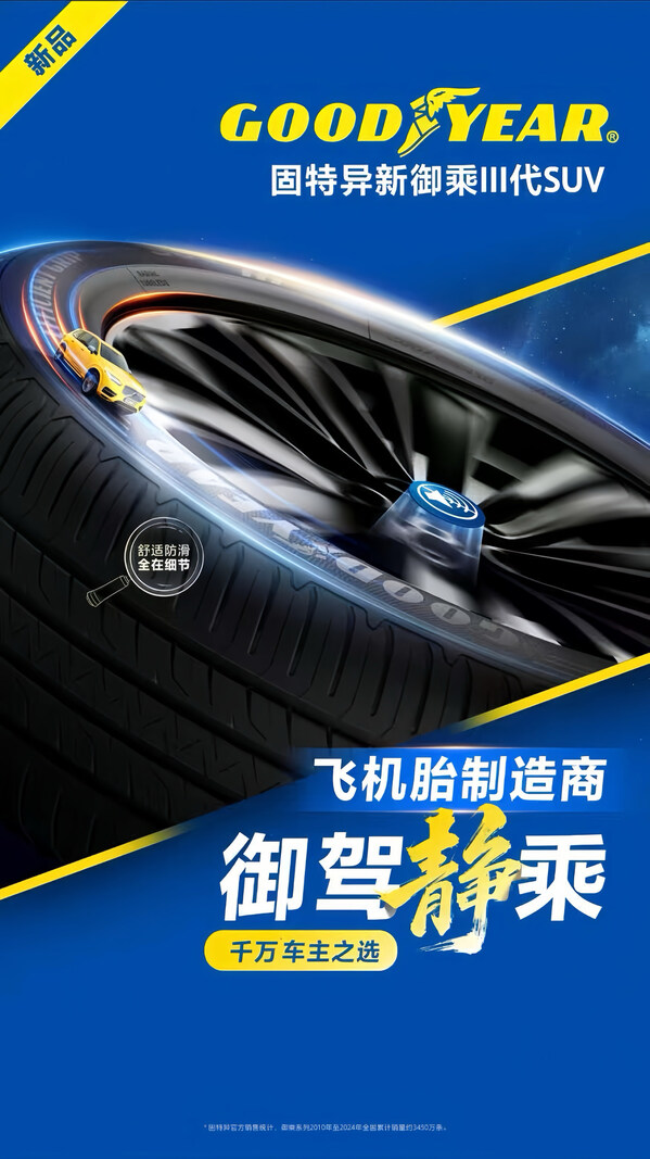 上海2025年3月25日 /美通社/ — 全球著名轮胎品牌固特异今日宣布其御乘III代系列,包含全新御乘III代SUV以及广受赞誉的御乘III代产品现已全面上线途虎平台。至此,固特异将扩充其在途虎平台上的高端轮胎产品矩阵,通过”正品直供+售后质保”体系,为中国车主提供更安全、更舒适的出行解决方案。