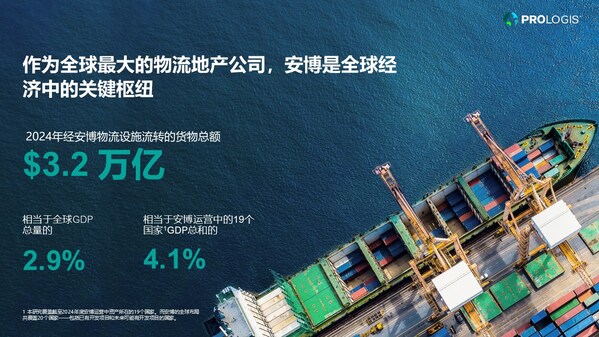 旧金山2025年7月31日 /美通社/ — 安博(Prologis,纽交所代码PLD)日前发布了由牛津经济研究院(Oxford Economics)撰写的一份关于其全球经济影响力的新报告。报告显示,2024年经由安博全球物流设施流转的商品总额接近 3.2 万亿美元,相当于全球国内生产总值(GDP)总量的 2.9%。