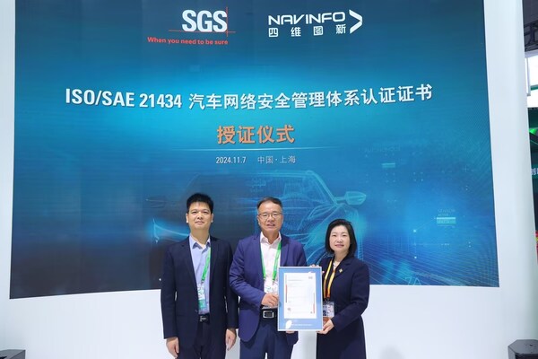 上海2024年11月9日 /美通社/ — 近日,在第七届中国国际进口博览会上,国际公认的测试、检验和认证机构SGS正式向北京四维图新科技股份有限公司、吉林航盛电子有限公司和联创电子旗下车载光学制造基地——合肥联创光学有限公司三家企业颁发了ISO/SAE 21434汽车网络安全管理体系认证证书,此次获证不仅是对三家企业在汽车网络安全领域的卓越成就和管理能力的权威认可,更为汽车行业的智能化、网联化发展树立了新的标杆。