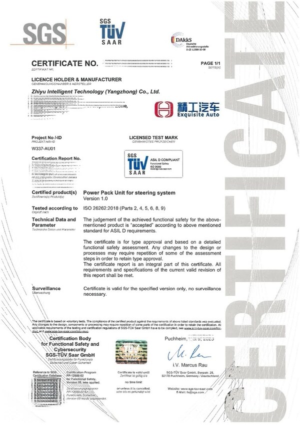 上海2026年1月23日 /美通社/ — 2026年1月20日,国际公认的测试、检验和认证机构SGS(以下简称”SGS”)为江苏智驭汽车科技有限公司(以下简称”江苏智驭”)自主研发的转向PPU产品颁发ISO 26262:2018功能安全ASIL D产品证书。获得此证书标志着江苏智驭在功能安全管理体系和产品开发方面已对标国际标准,其自主研发的转向PPU产品已经符合功能安全ISO 26262 ASIL D最高级别要求。