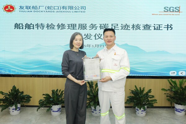 上海2025年1月22日 /美通社/ — 1月21日,SGS通标标准技术服务有限公司(以下简称SGS)为友联船厂(蛇口)有限公司(以下简称蛇口友联)颁发了船舶特检维修领域首张碳足迹证书,这一成就标志着蛇口友联在绿色低碳发展道路上迈出了坚实的一步,并在碳足迹管理方面取得了显著成效。SGS限用物质测试服务部全球负责人吴梅、蛇口友联副总经理颜长青等双方代表出席颁证仪式。