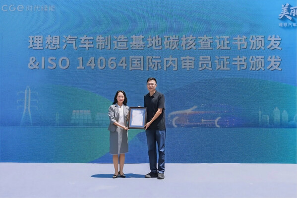 常州 2025年6月10日 /美通社/ — 2025 年 6 月 5 日,理想汽车 “美丽中国我先行” 环境日主题活动在常州举行,活动现场,SGS 向理想汽车北京和常州智能制造基地颁发碳核查证书,并对研发、制造、供应链等部门授予 ISO 14064 温室气体内部核查员证书。理想汽车制造运营负责人卫延、SGS通标常州分公司总经理朱眺茵共同出席颁证仪式。